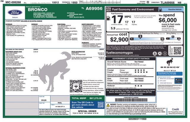 Avalanche Gray 2026 Ford Bronco Badlands 4WD 10-Speed Automatic 2.7L EcoBoost V6 17/17 City/Highway MPG