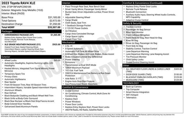 CLEAN CARFAX... NO ACCIDENTS, INCLUDES PREPAID MAINTENANCE, AWD, Black Cloth, 3 Spoke Leather Heated Steering Wheel, Convenience Package, Front Door Smart Key System w/Push Button Start, Front Seat Heating, Rain Sensing Front Wipers, Tilt & Slide Moon Roof, XLE Grade Weather Package. Magnetic Gray Metallic 2023 Toyota RAV4 XLE AWD 8-Speed Automatic 2.5L 4-Cylinder DOHC Dual VVT-i